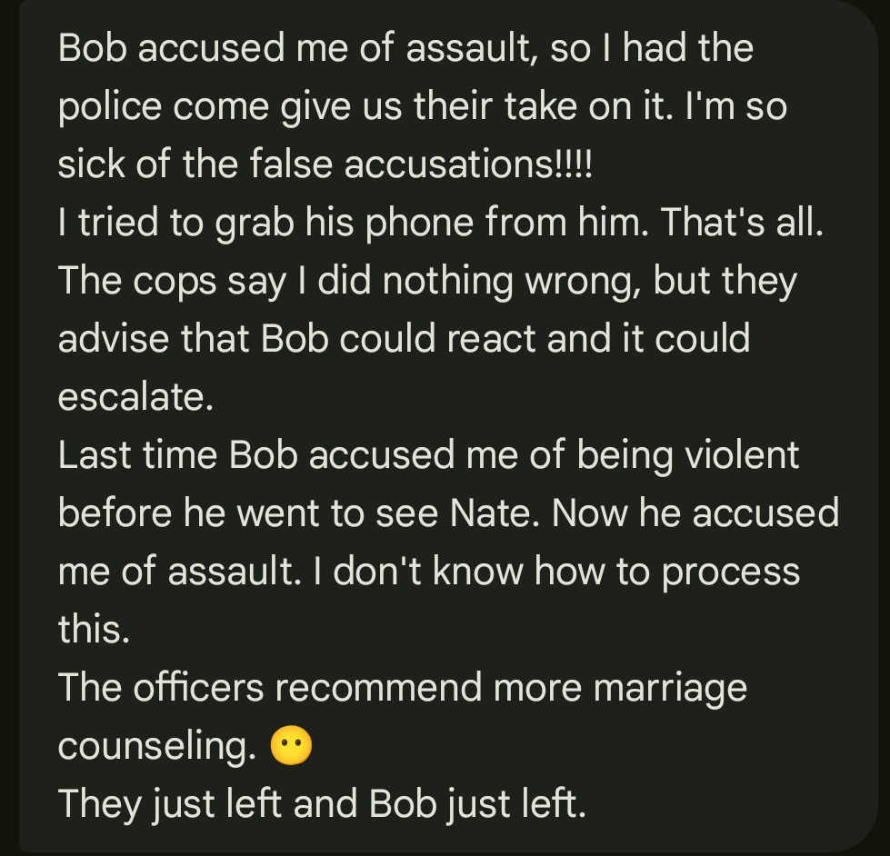 The police need to interview Kelly and me. They don't seem eager to intervene, beyond suggesting more counseling. They advise me to leave to give Kelly some time to cool off. Kelly takes this opportunity to send a text message to as many friend and family as she can to get her side of the story out. (Read text message) She tells Miranda that she had to call the police because I said something she didn't like.
